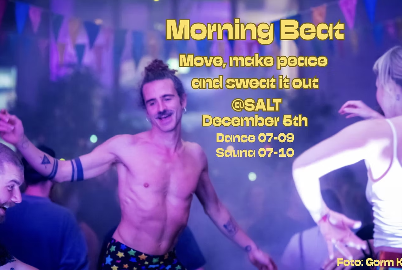 Move & Sweat // Saul&Sauna We're returning to SALT, this time on a Friday! Join us for morning dance from 07:00-09:00 in Langhuset, and as always at SALT, you can grab a Dance + Sauna ticket to flow between the floor and the heat from 07:00–10:00. This edition marks the start of Oslo Peace Days, so come move, make peace, and sweat it out with us! Rumor has it that the magnificent Miwa will guide us through breath of peace (breathwork). Good to know: * Dance 07-09 * Sauna 07-10 * You can check-in whenever you want during the event * DJ: TBA