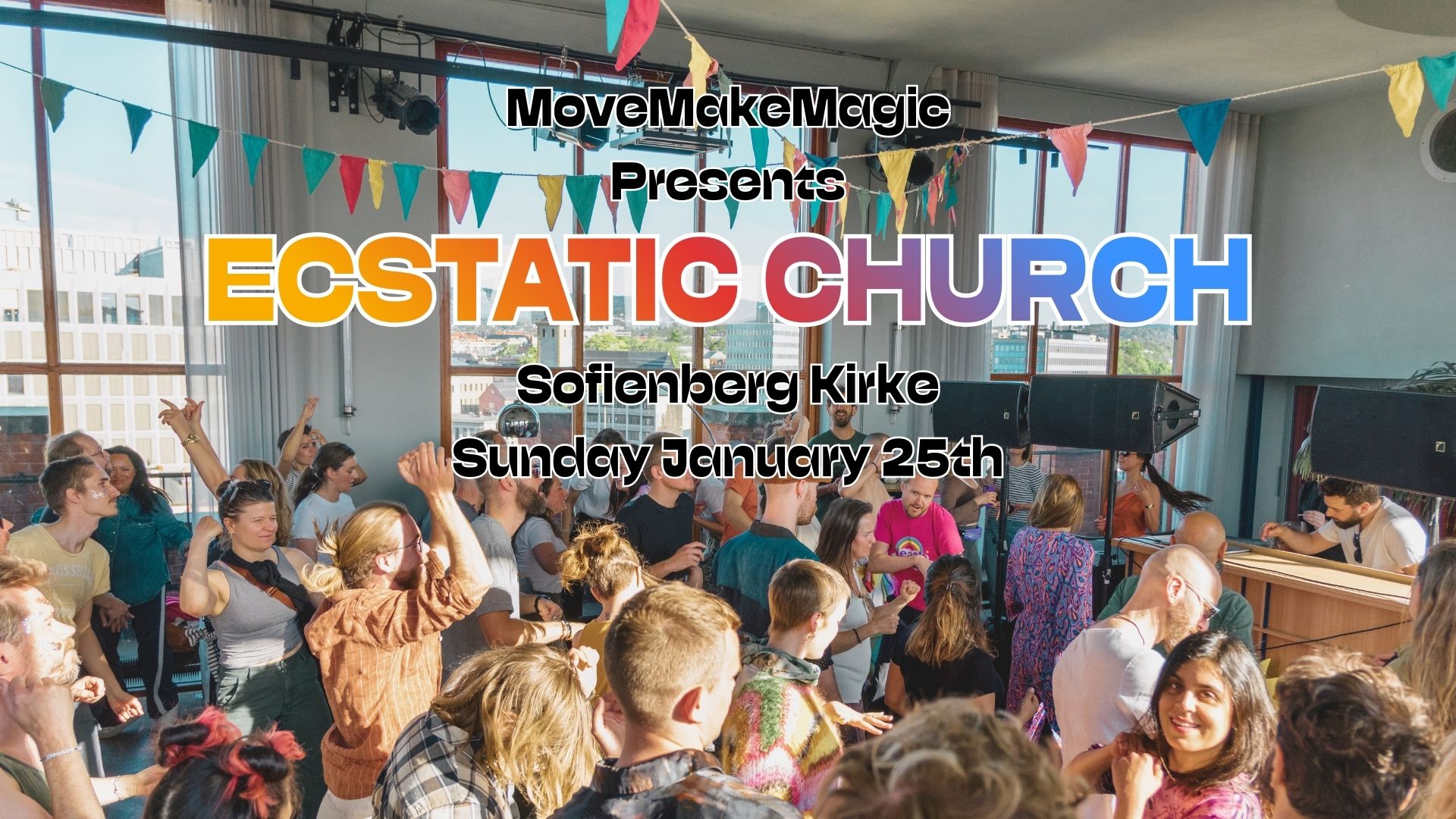 Ecstatic Church av MoveMakeMagic En dag der kirken blir et dansegulv. Bevegelse i stedet for ord. Musikk i stedet for prekener. En rusfri, mobilfri danseopplevelse i det hellige rommet i Sofienberg kirke. Ingen prat. Ingen rus. Bare nærvær, lyd og bevegelse. Musikk: TBA