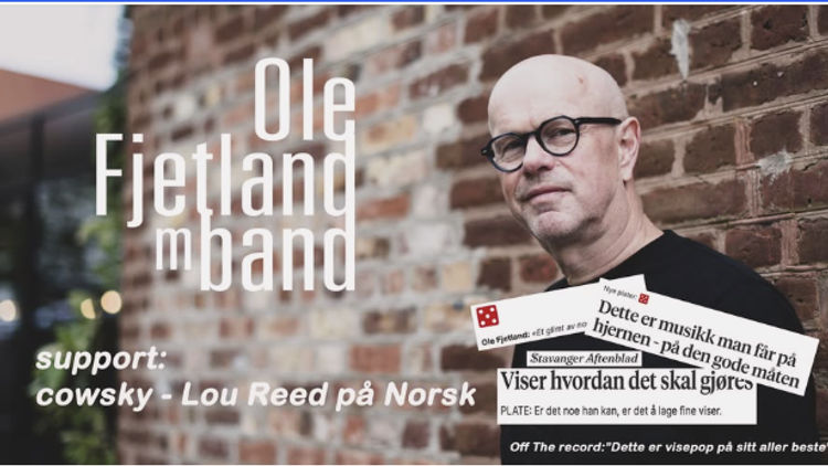 Rogalandsk visepop med stort spenn, fengende rytmikk og særegne tekster. Med sarte ballader, energisk viserock og latininspirert visejazz og – og med tekster om alt fra irriterende hersketeknikker, klimadilemma og den fantastiske og umulige kjærligheten er det duket for en varm og spennende konsertopplevelse denne kvelden. Ole Fjetland har fått med seg drevne musikere med musikalske røtter i alt fra hardrock, visejazz til den blåeste blues på sin første konsert i Oslo tirsdag 17. mars. Fra desperat viserock til såre oppbruddsduetter Musikalsk velger Ole fra de fleste sjangre, men i bunn ligger det alltid et rytmisk driv og spennende harmonier. Fra tidligere års utgivelser er kjærlighetsvisen "Flig av himmelen" og den mer agressive «Det va eg så gjorde det» eksempler på dette. I 2025 kom singlene «Når våren sedde dørå på klem", "Et glimt av noe", "Alltid etterpå" og «Uværet» - viser fra hele det musikalske spekteret. Tekstene er viktige for Ole og han plukker også tema og inntrykk fra lyse og mørke øyeblikk både privat og fra en lang og stormfull karriere. Viser om verdens sørgelige tilstand, mennesker som ikke fikser livet så godt, men også kjærlighetserklæringer til hverdagen og til øyeblikkets magi. Support - Cowsky - spennende tolkninger av Lou Reed i norsk oversettelse Fint å vite: * Aldersgrense 20 år